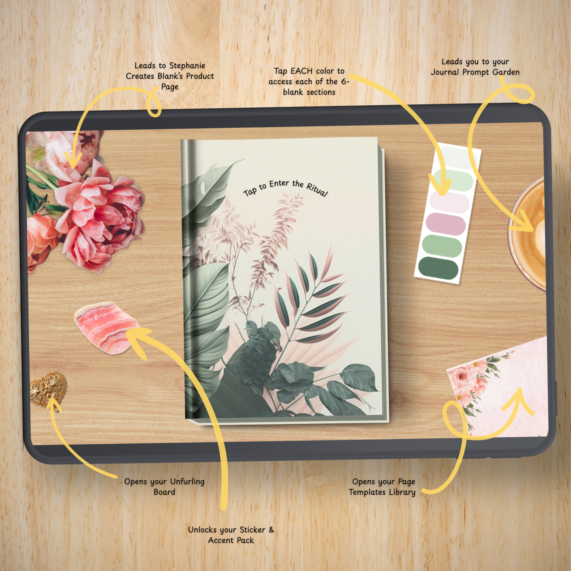 A grounding, gently guided digital journal designed for overwhelmed humans who want a soft, sustainable gratitude practice. Filled with calming plant-inspired pages, thoughtful prompts, hyperlinked navigation, and a full sticker library — all crafted in collaboration with Stephanie Creates Blank.